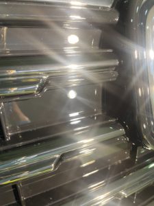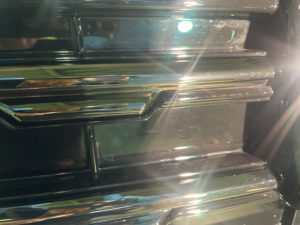 細かな形状のグリル部分などのパーツは新車のお車でも水シミなどの汚れが付着しています。